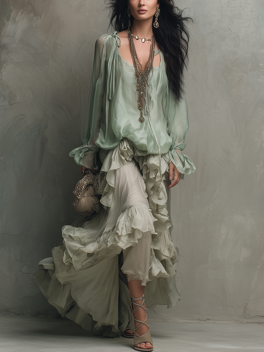 Bohemian Mint Chiffon Ruffle Blouse With Layered Skirt