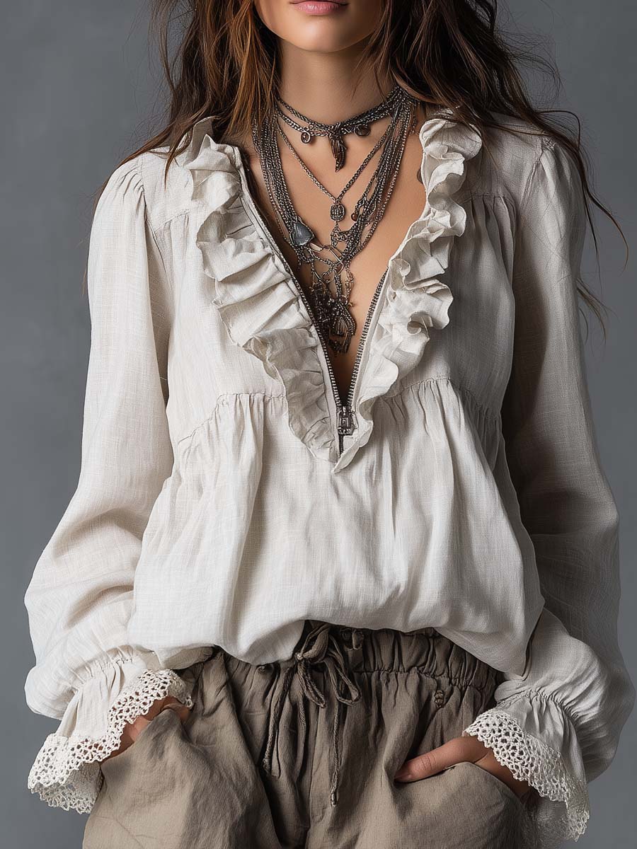 Effortless Zip-up Collar Ruffled Cotton Linen Blouse