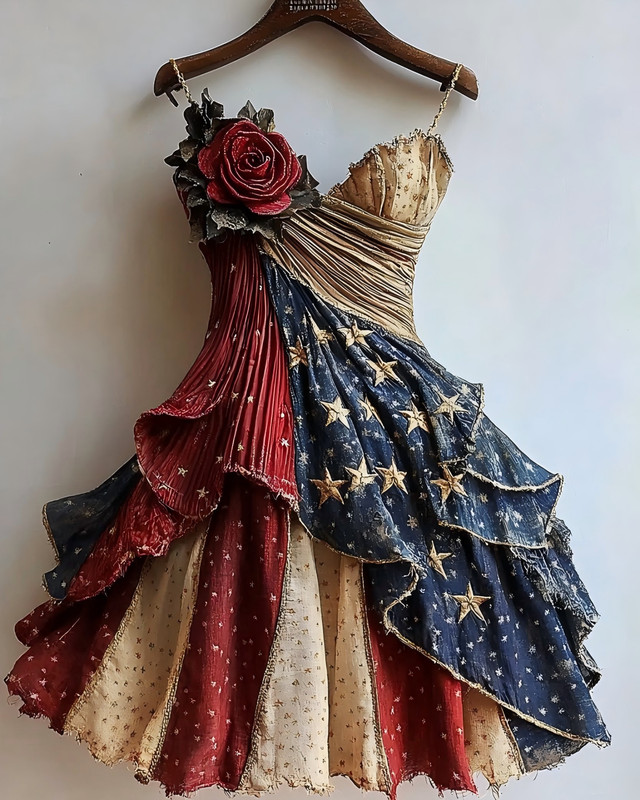 Independence Day themed print rose flower gilded dress 7418