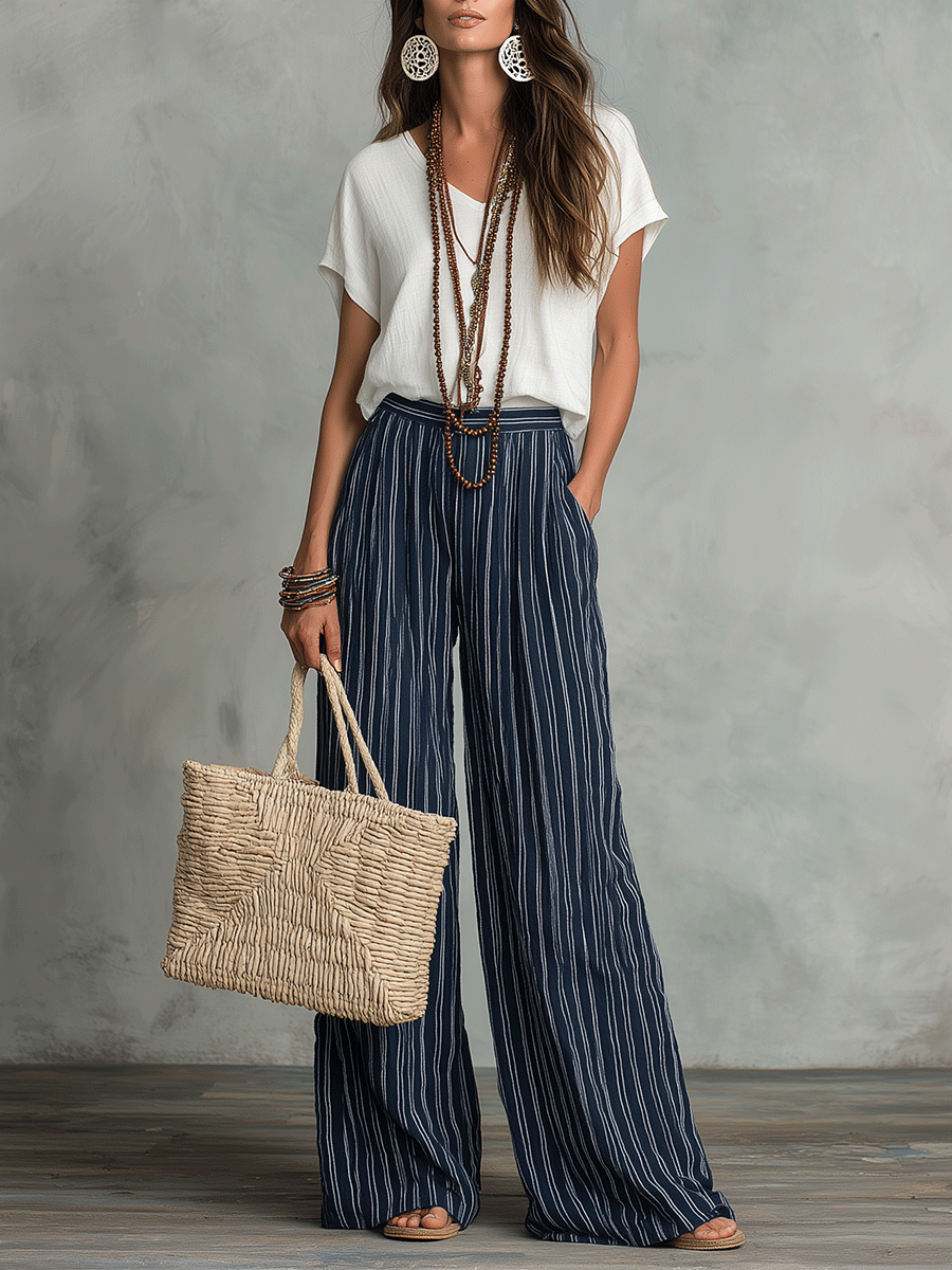Relaxed Effortless Bohemian Stripe Wide-Leg Pants Set