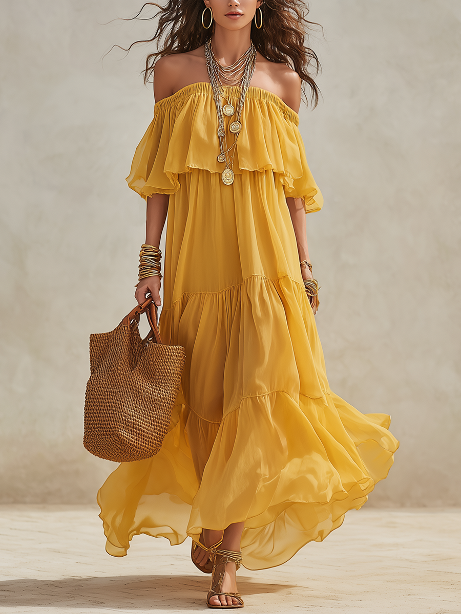 Vibrant Sunflower Yellow Off-the-Shoulder Tiered Chiffon Maxi Dress